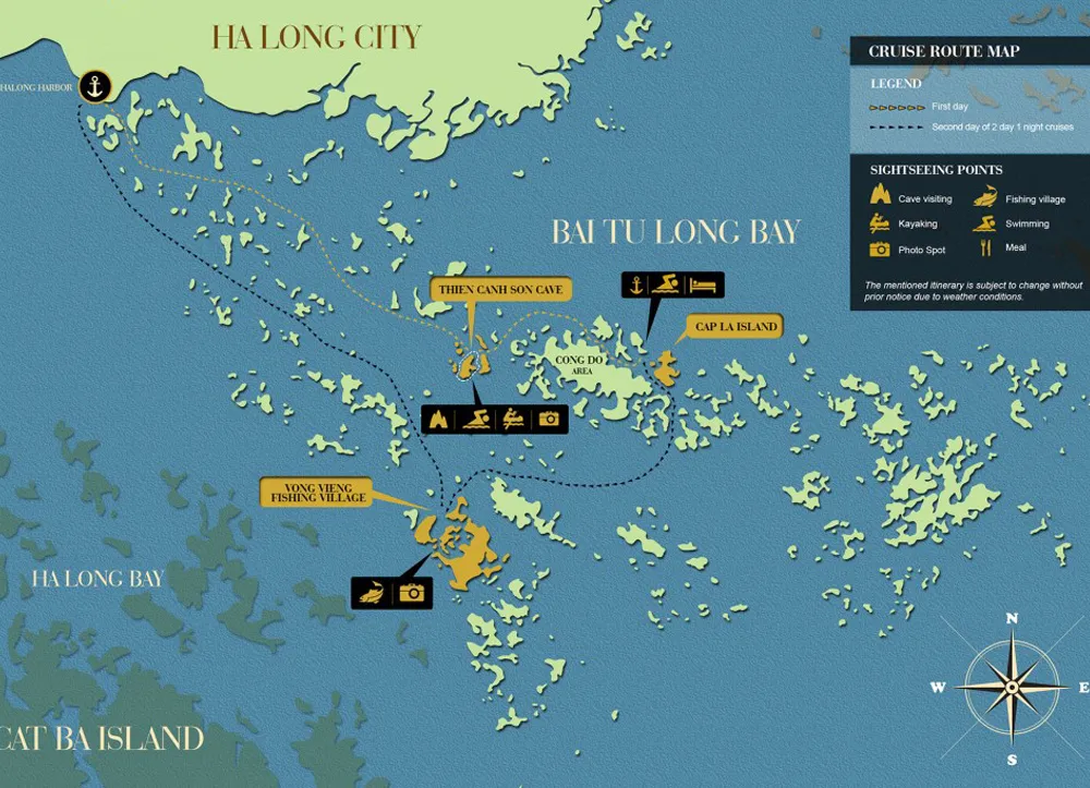 13:00: Enjoy a delicious Vietnamese Set Menu while our boat cruises leisurely to the heart of Bai Tu Long Bay, Cap La area.