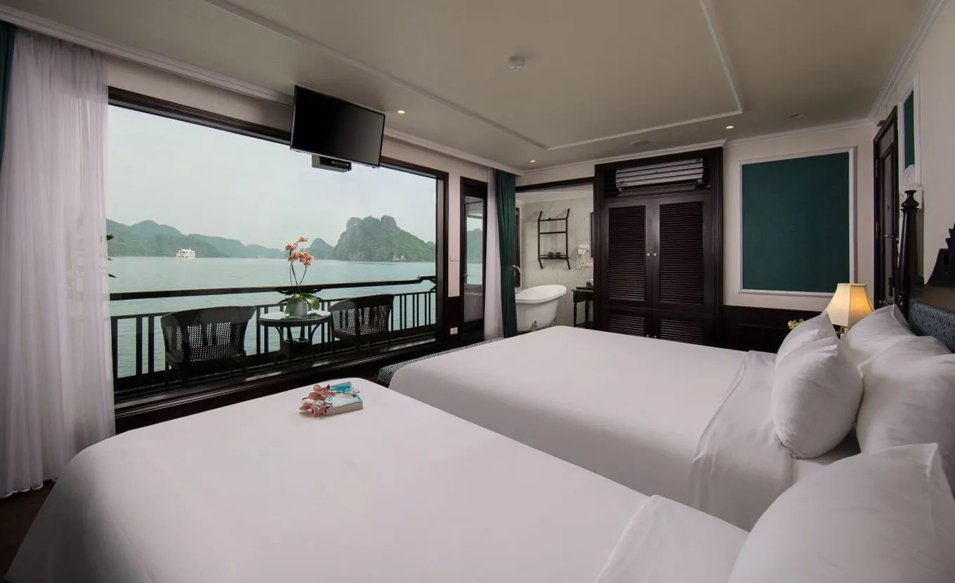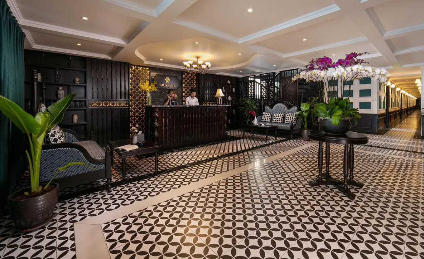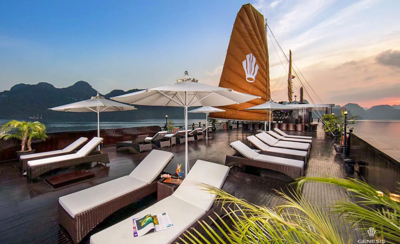 The Genesis Regal Cruise, launched in 2019, beautifully fuses Vietnamese royal tradition with French colonial style. It houses 20 spacious cabins, each with private balconies and sea-facing beds — a rarity among yachts. Offering luxurious facilities like indoor/outdoor dining, bars, a swimming pool, Jacuzzi, and an expansive 800m2 sundeck. Beyond the usual spots, Genesis Cruise provides diverse activities: from swimming at pristine beaches, Tai Chi classes, cooking sessions, fishing, and visits to local homes.
