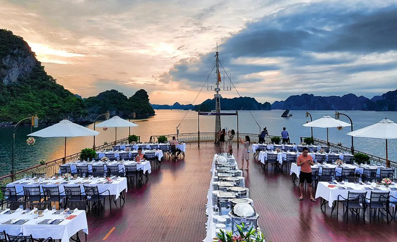 12:15: Guests are transferred by speedboat/tender from Indochina Sails’s Tuan Chau Pier to Indochine Cruise - enjoy welcome drink, listen cruise briefing and safety instructions.