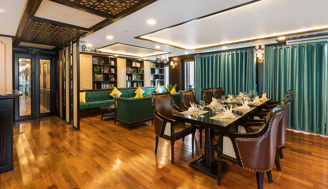 13:15 A delicious set lunch is served in Ha Long Restaurant while the cruise sails past Chan Voi (Elephant Feet) and Tra Bau Area.