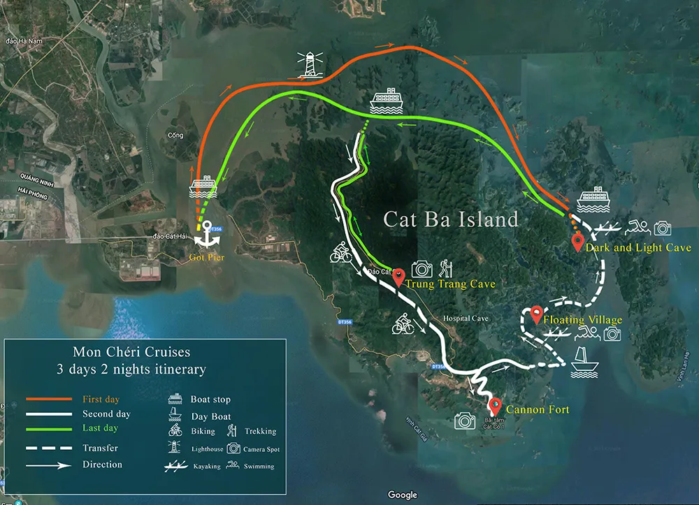 15:30: We arrive at Light and Dark Cave, where you can do kayaking or bamboo boat rowed by local people. Then return to Mon Chéri Cruises, followed by swimming near the ship.