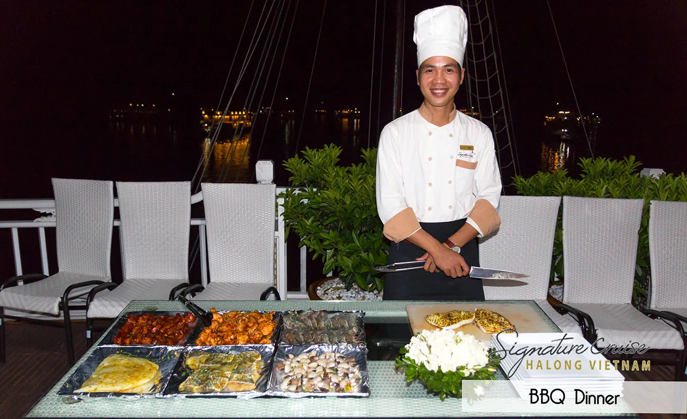 20:45 – 24:00: Your free time to relax with an exotic cocktail or whatever takes your fancy. Our bar has a wide range or wines, beers and liquors and is always a welcome sight for guests after a day on Halong Bay. Order a specialized massage in room. Choosing with other activities boat cruise such as watch documentary movies, squid fishing or simply relax on our roof top deck under the cover of a star filled sky.