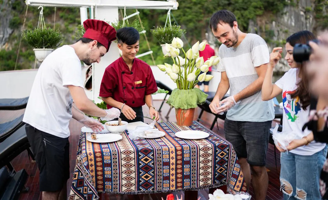 12:15: Check-in and the junk starts cruising to Lan Ha Bay. It travels through a floating fishing village. Enjoy the fist one-hour scenic cruise in Lan Ha Bay in between hundreds of stunning sheer limestone islands before the lunch stop by the beaches of Ba Trai Dao.