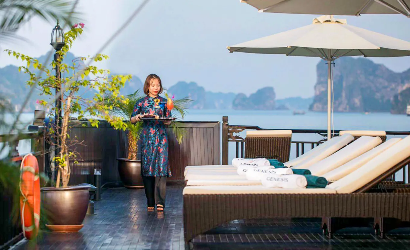 The Genesis Regal Cruise, launched in 2019, beautifully fuses Vietnamese royal tradition with French colonial style. It houses 20 spacious cabins, each with private balconies and sea-facing beds — a rarity among yachts. Offering luxurious facilities like indoor/outdoor dining, bars, a swimming pool, Jacuzzi, and an expansive 800m2 sundeck. Beyond the usual spots, Genesis Cruise provides diverse activities: from swimming at pristine beaches, Tai Chi classes, cooking sessions, fishing, and visits to local homes.