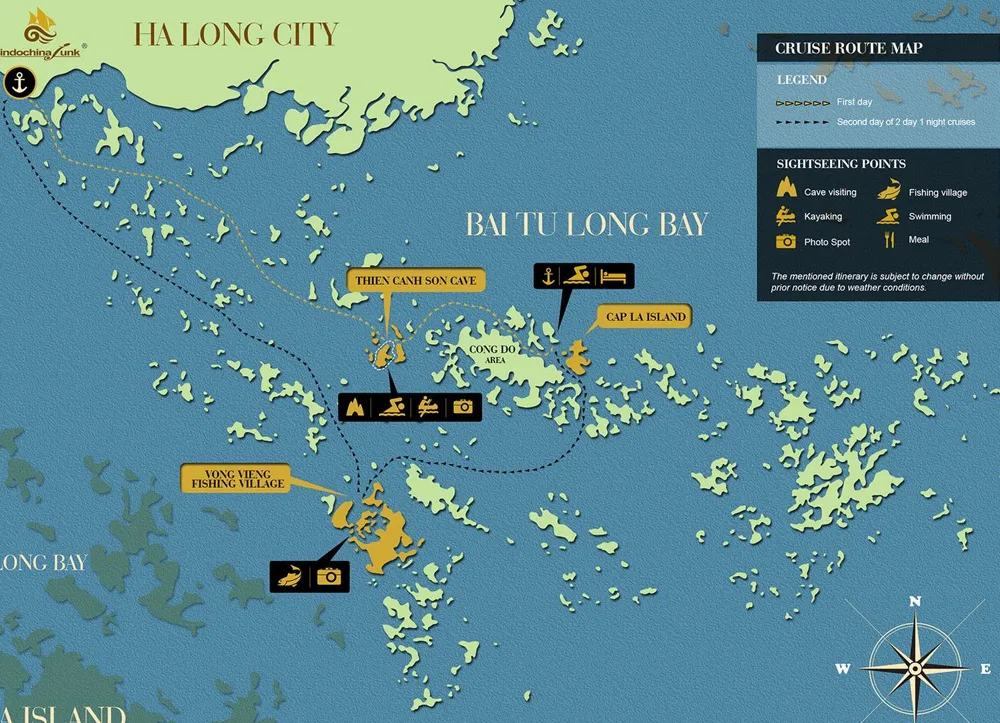 13:30 – 15:00: Have lunch while cruising to magnificent Bai Tu Long bay; admire the fascinating formations on the way.