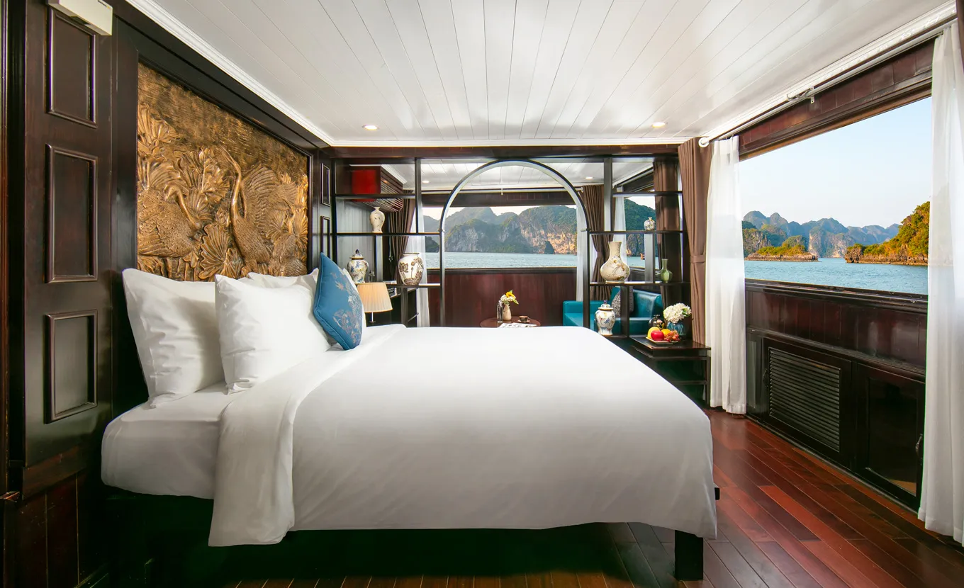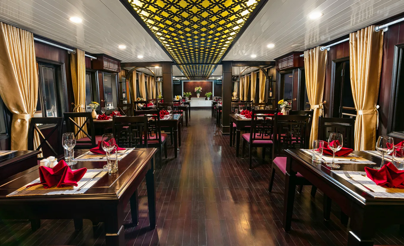 La Regina Classic, the newest ship of the La Regina Cruise Team, stands out with its oriental design. The ship blends modern and ancient styles, creating a unique and inviting atmosphere. The luxurious and sophisticated space feels akin to a royal palace on the tranquil blue sea.