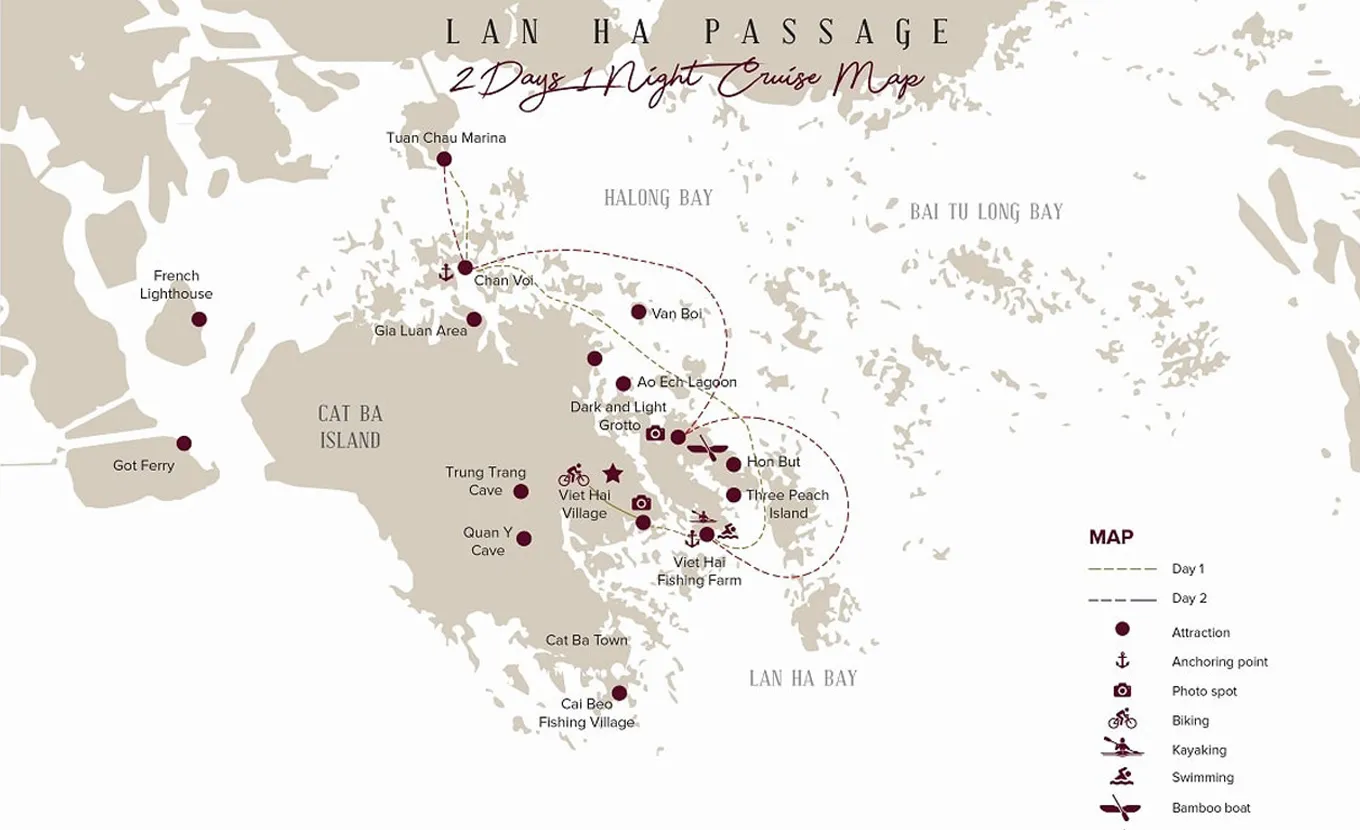 13:00: We're off to explore Lan Ha Bay. Relax and savor a meal featuring the wonderful flavors of Vietnamese cuisine, away from the usual tourist routes.