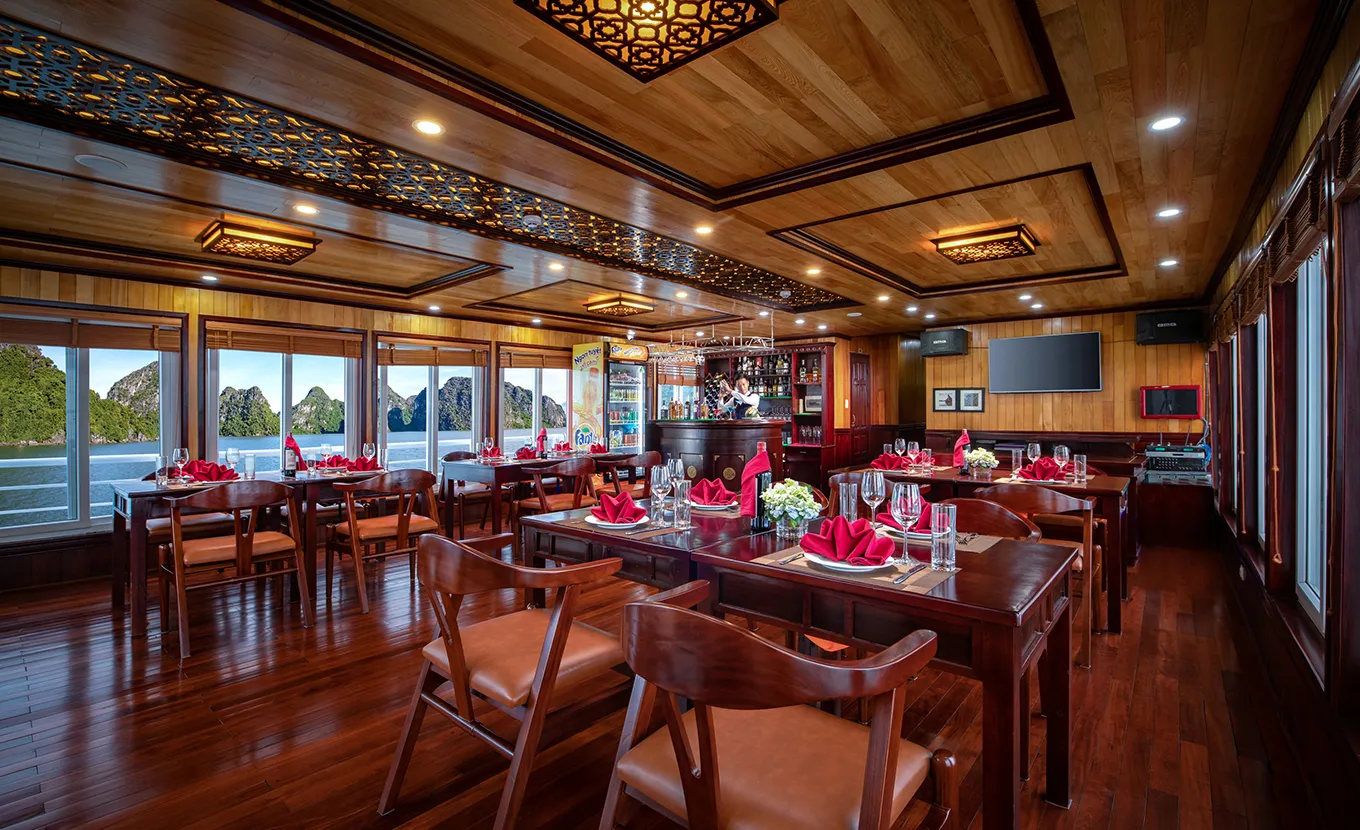 13:15: Enjoy lunch with sampling regional fresh seafood while cruising on exquisite water, passing Incense Burner Island, Fighting Cock islet,Stone Dog… Lavender Cruise will bring you to explore Ha Long Bay on the most wonderful route where just a few cruises go through.