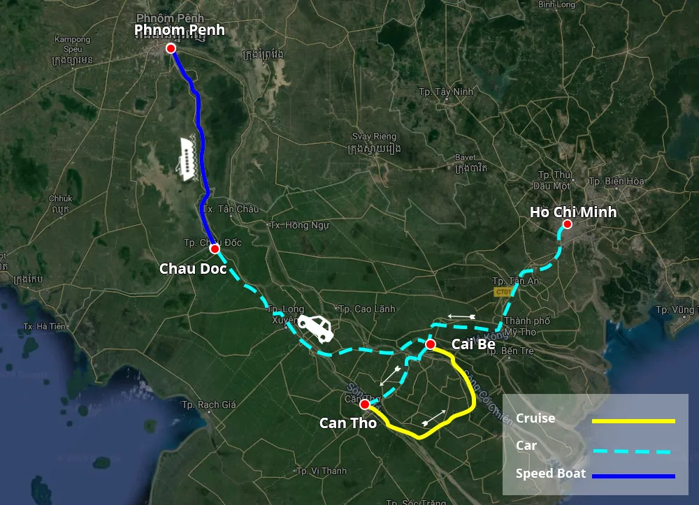 Explore the typical Mekong Delta for 3 days by wooden boat. Travel by speed boat to Phnom Penh capital of Cambodia. The journey brings you unforgettable experiences once in your life.