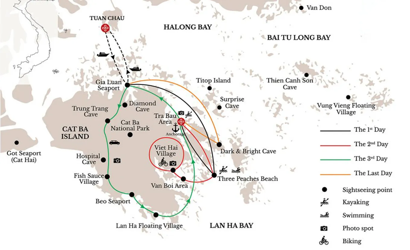 15:00: Visit the Dark and Bright Cave – famous for its pristine natural beauty and poetic, attractive seascape of Lan Ha Bay. Take photos of the romantic, lyrical local sights. This is the best time for tourists to enjoy bamboo boats or swimming, revealing the true beauty of the Limestone Mountains and the blue sky of Lan Ha Bay. Afterward, immerse in the emerald green water of Lan Ha Bay with exciting swimming activities.