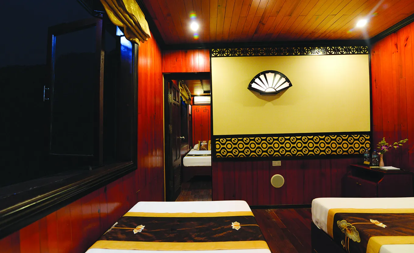 19h00: Sumptuous set dinner on board.20.30 - 22.00: Free time to challenge yourself in Vietnamese puzzle games or gather your group/family for a board game; try your luck with squid fishing or simply have a cocktail and enjoy the quiet night on the bay.
