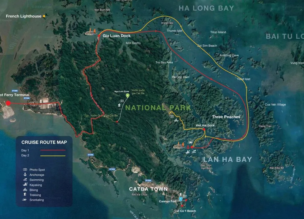 8:00 AM: Pick up at your hotel (in the Hanoi Old Quater). Drive two and a half hour from Hanoi to Hai Phong on the free-way AH 5B enjoying the landscape of rice field and rural villages of the Red river Delta. Arrive at the Got harbor, take 25 minutes on the ferry to Cat Ba Island, drive along the coastal road for amazing views to the bay and the valley shadowed paths through the National Park to the island center.